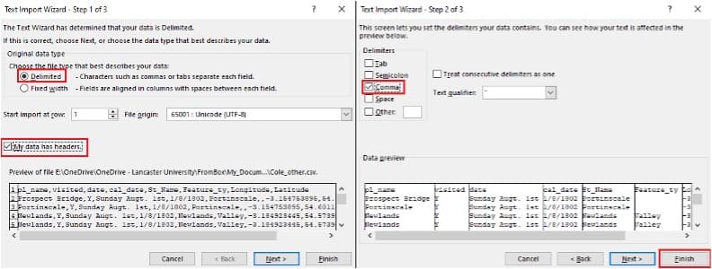 • Click Next to proceed to Step 2, where you need to select your ‘Delimiters’: make sure Comma is selected. You can then click Finish (leaving the defaults selected for Step 3).