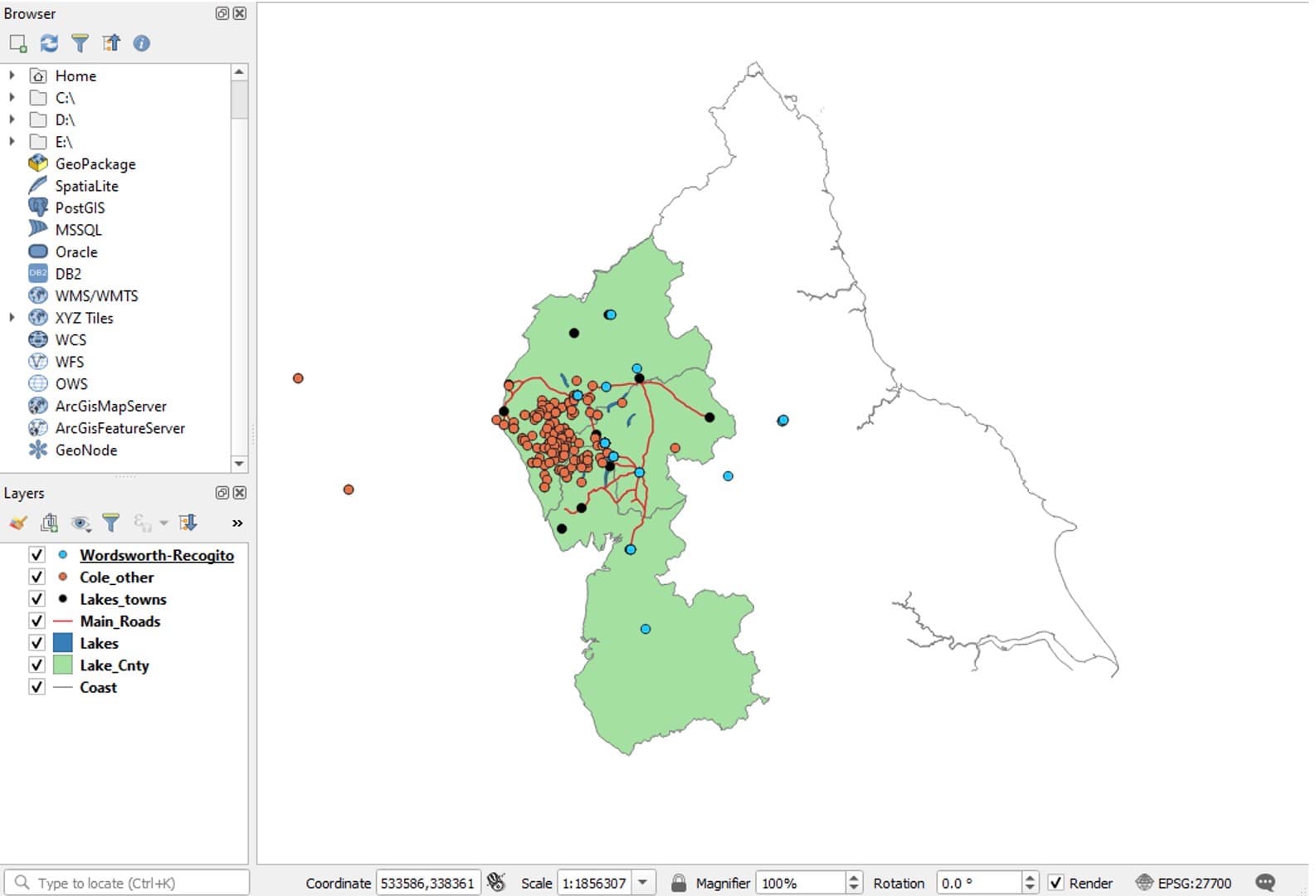 First, we will load the Cole_other.csv file into QGIS – this file already contains coordinates, so it is a straight-forward process to visualise this data in QGIS.