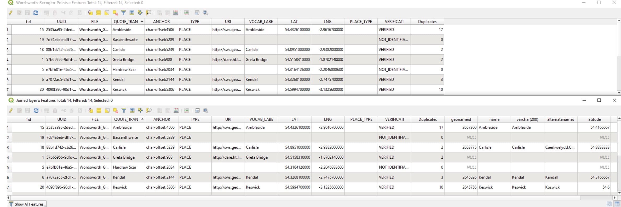 • The vast majority of these places are not needed for our purposes, however. We can join our Wordsworth-Recogito-Points data to GeoNames’ GB_Gaz to create a new layer that combines this data.