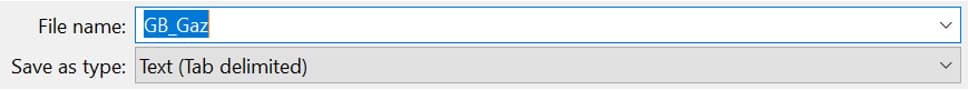 • Finally, save the file as a text file by clicking Save As and selecting Text (Tab delimited). Call the file GB_Gaz.