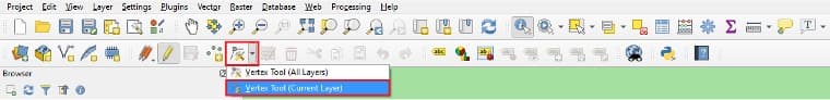 • To start manipulating our data, we need to open the Processing Toolbox in QGIS. To do this, you can select Processing > Toolbox from the drop-down menu at the top, or you can click on the ‘gear’ icon highlighted in red below: