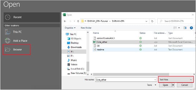 • When the dialog box appears, navigate to location where you saved the DARIAH-GTA folder earlier, and make sure to change the menu in the bottom right corner from All Excel Files to Text Files (see above).